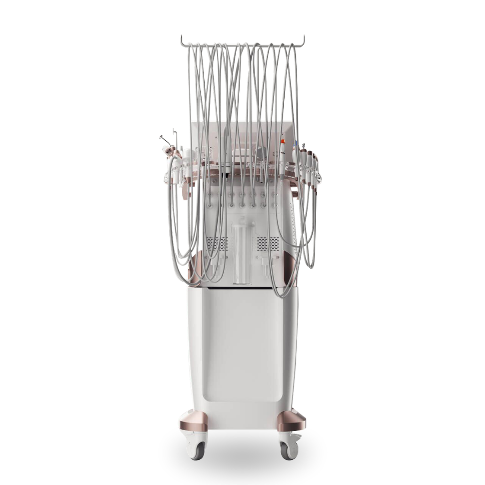 15-calowy ekran dotykowy LCD z intuicyjnym interfejsem pozwala na błyskawiczny wybór zabiegów – każda głowica ma osobny ekran z animacjami wizualnymi. Sterowanie dotykowe oraz przełączniki na głowicach umożliwiają pełną kontrolę nad parametrami zabiegu. Urządzenie pracuje przy napięciu 110–240V, 50–60Hz, moc 150VA, co czyni je uniwersalnym dla gabinetów na całym świecie.