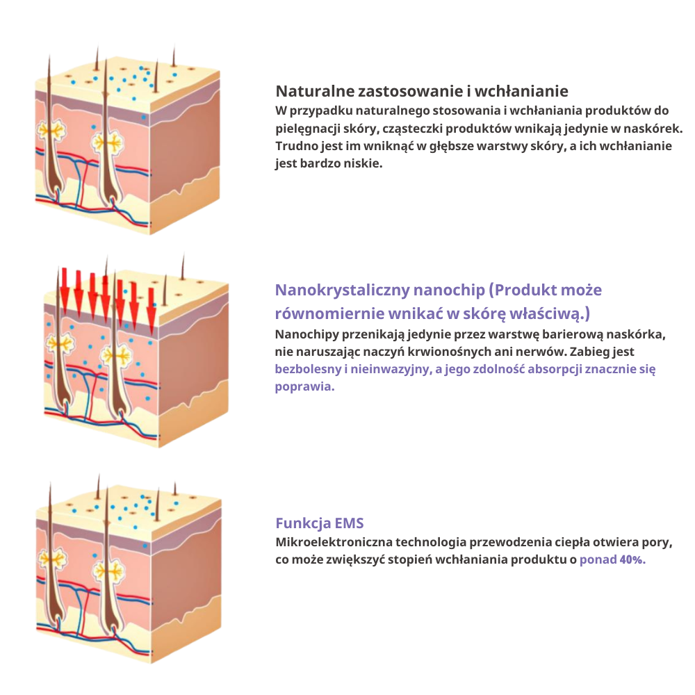Nanomezoterapia EMS opiera się na technologii nanokryształów o grubości do 250 nanometrów i długości 0,1 mm. Nanochip otwiera wyłącznie warstwę rogową naskórka (stratum corneum) bez ingerencji w naczynia krwionośne i nerwy, zwiększając absorpcję składników aktywnych o ponad 40% w porównaniu do tradycyjnej aplikacji kosmetycznej. Mikroelektroniczna technologia przewodnictwa cieplnego EMS dodatkowo pobudza krążenie i transport składników odżywczych.