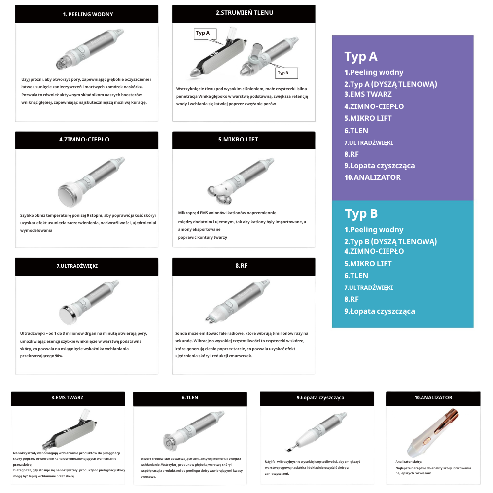 Bipolarny RF (HR) pracuje w zakresie częstotliwości 0,2–0,5 MHz i generuje kontrolowane ciepło w głębszych warstwach skóry, pobudzając syntezę nowego kolagenu i elastyny. Terapia ciepło-zimno (ciepło 36–46°C, zimno 0–6°C) wspomaga lifting termiczny, regeneruje komórki i przywraca aktywność skóry wrażliwej. Sonoforeza z częstotliwością ultradźwięków 1,1 MHz otwiera pory, umożliwiając penetrację składników aktywnych do warstwy podstawnej skóry ze stopniem absorpcji przekraczającym 90%. Skin Scrubber działa w zakresie 26–30 kHz i mechanicznie złuszcza martwy naskórek, usuwa zaskórniki i rozjaśnia cerę. Tlenoterapia infuzyjna (długopis tlenowo-wodny) wtryskuje składniki odżywcze bezpośrednio do skóry właściwej z prędkością 450 m/s przy ciśnieniu 50–85 kPa, głęboko nawilżając i stymulując regenerację komórkową.
