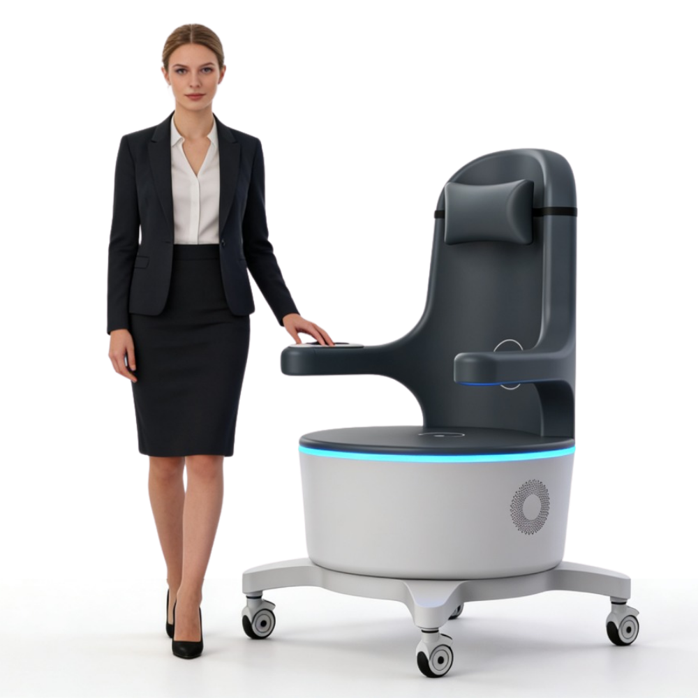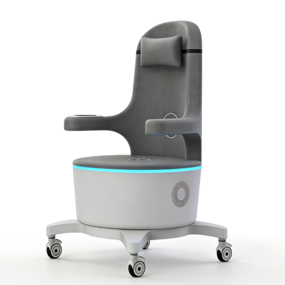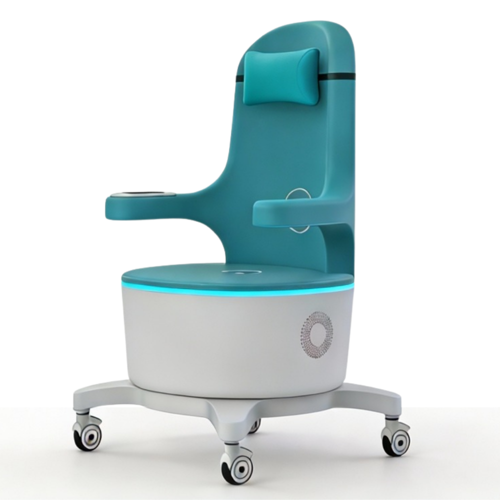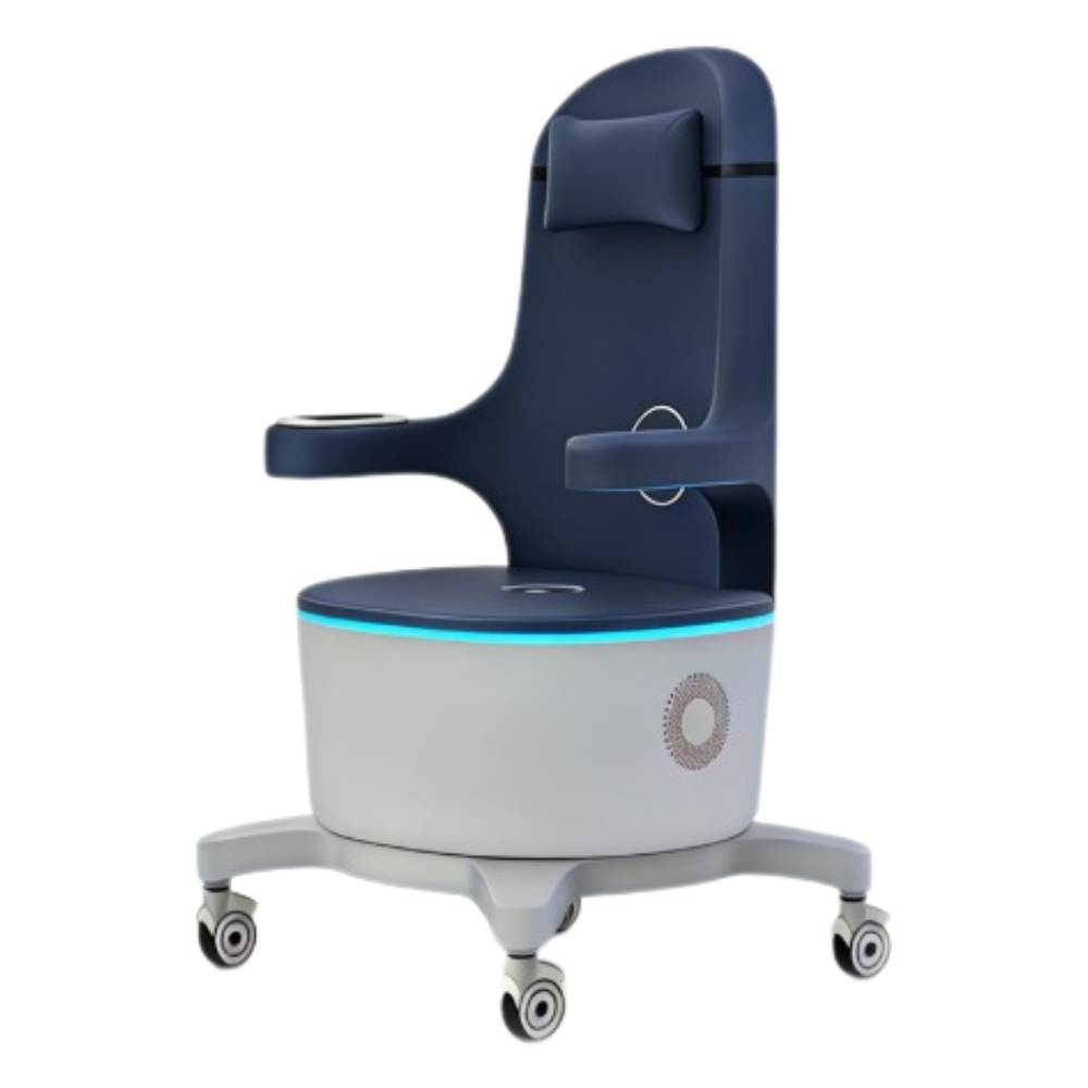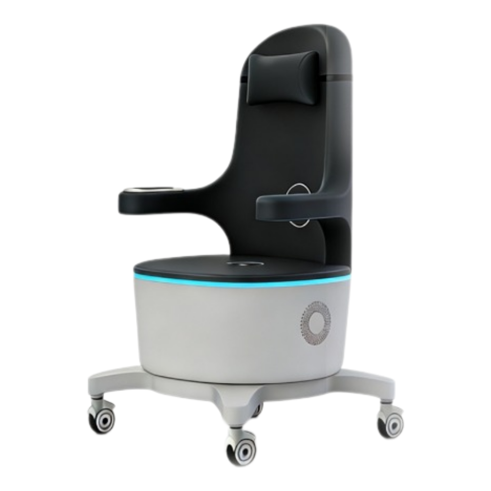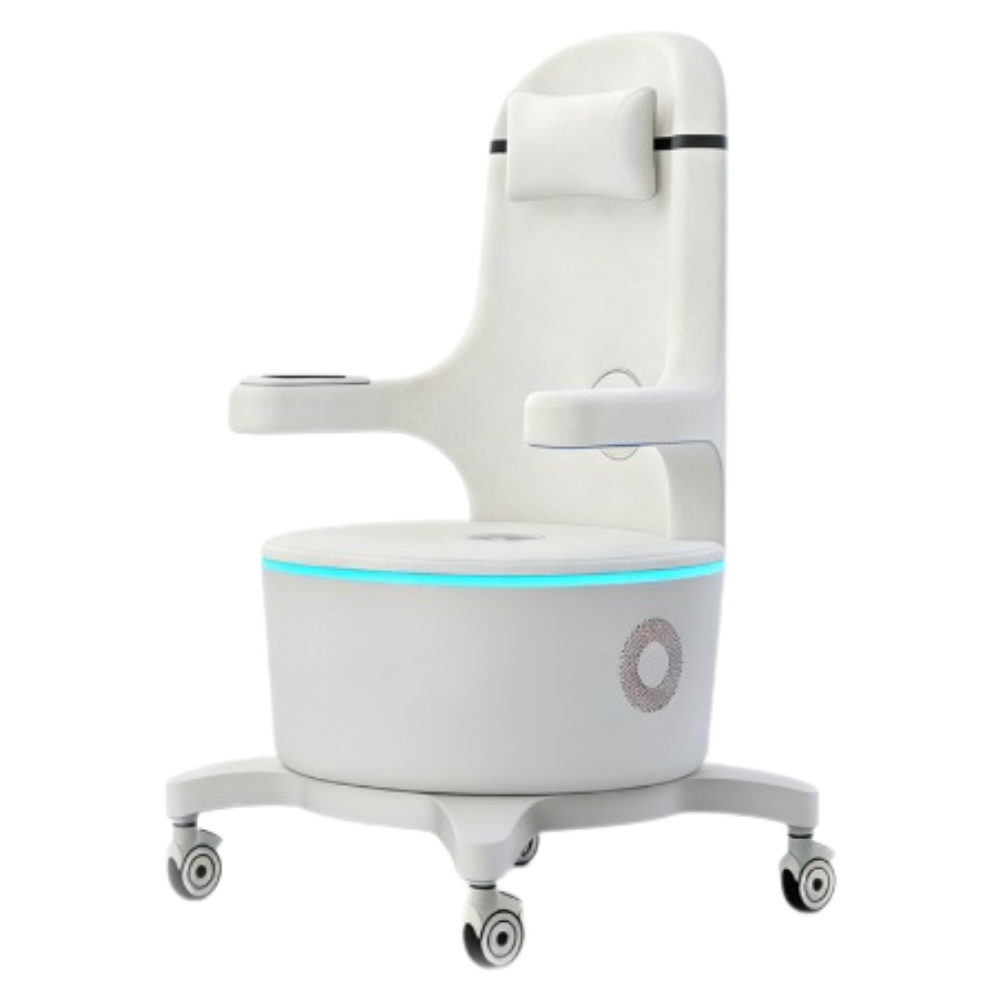 Fotel wyposażony jest w intuicyjny panel dotykowy zamontowany na bocznym ramieniu, umożliwiający łatwą obsługę bez przerywania zabiegu. Podświetlenie LED w podstawie tworzy profesjonalny efekt wizualny i wyróżnia urządzenie w przestrzeni gabinetu. Mobilna konstrukcja na kółkach obrotowych ułatwia przemieszczanie fotela w obrębie gabinetu. Zagłówek i ergonomicznie ukształtowane siedzisko zapewniają komfort podczas całej 28-minutowej sesji.