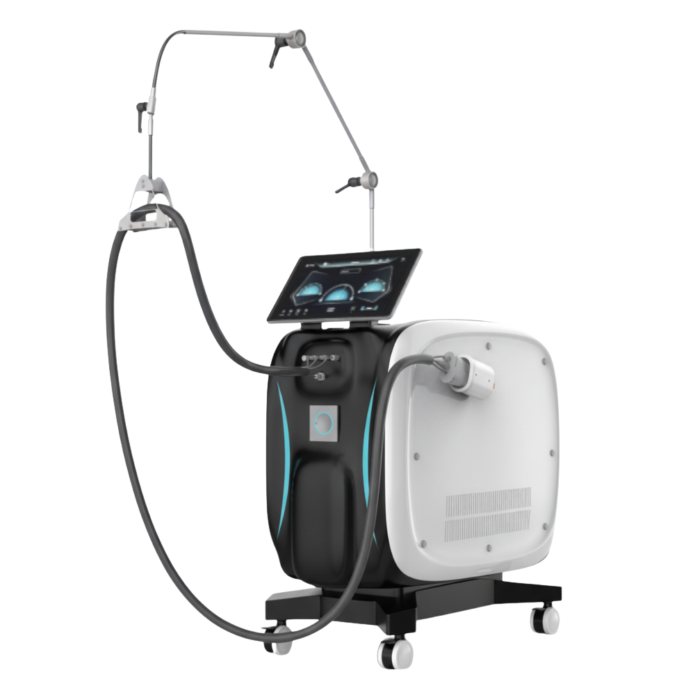 System chłodzenia trójstopniowy (TEC, powietrze, woda) z kondensatorem termoelektrycznym TEC zapewnia precyzyjną kontrolę temperatury bez hałasu. Rurka powietrzna dostarcza dodatkowy strumień chłodnego powietrza bezpośrednio na skórę pacjenta podczas zabiegu, co znacząco zwiększa komfort i eliminuje dyskomfort termiczny. Urządzenie o mocy 4000W pracuje przy zasilaniu AC 110V/220V.