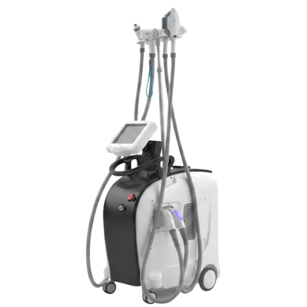 Skynexis 4w1 to zaawansowany kombajn zabiegowy łączący w jednej platformie cztery niezależne technologie: laser diodowy 808nm do trwałej depilacji, technologię SHR IPL do fotoodmładzania i depilacji światłem, laser Nd:YAG do usuwania tatuaży i przebarwień oraz radiofrekwencję ICE RF do liftingu i ujędrniania skóry. Urządzenie wyposażono w cztery dedykowane głowice (808nm Handle, IPL Handle, YAG Handle, RF Handle) oraz intuicyjny ekran dotykowy z wyborem języka interfejsu. Konstrukcja mobilna na kółkach z uchwytem transportowym i przyciskiem awaryjnym gwarantuje bezpieczeństwo i wygodę pracy w gabinecie.